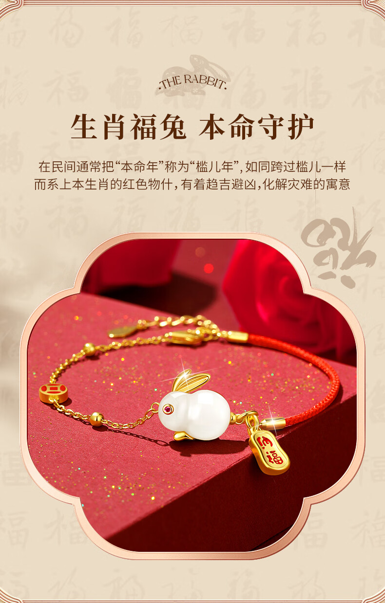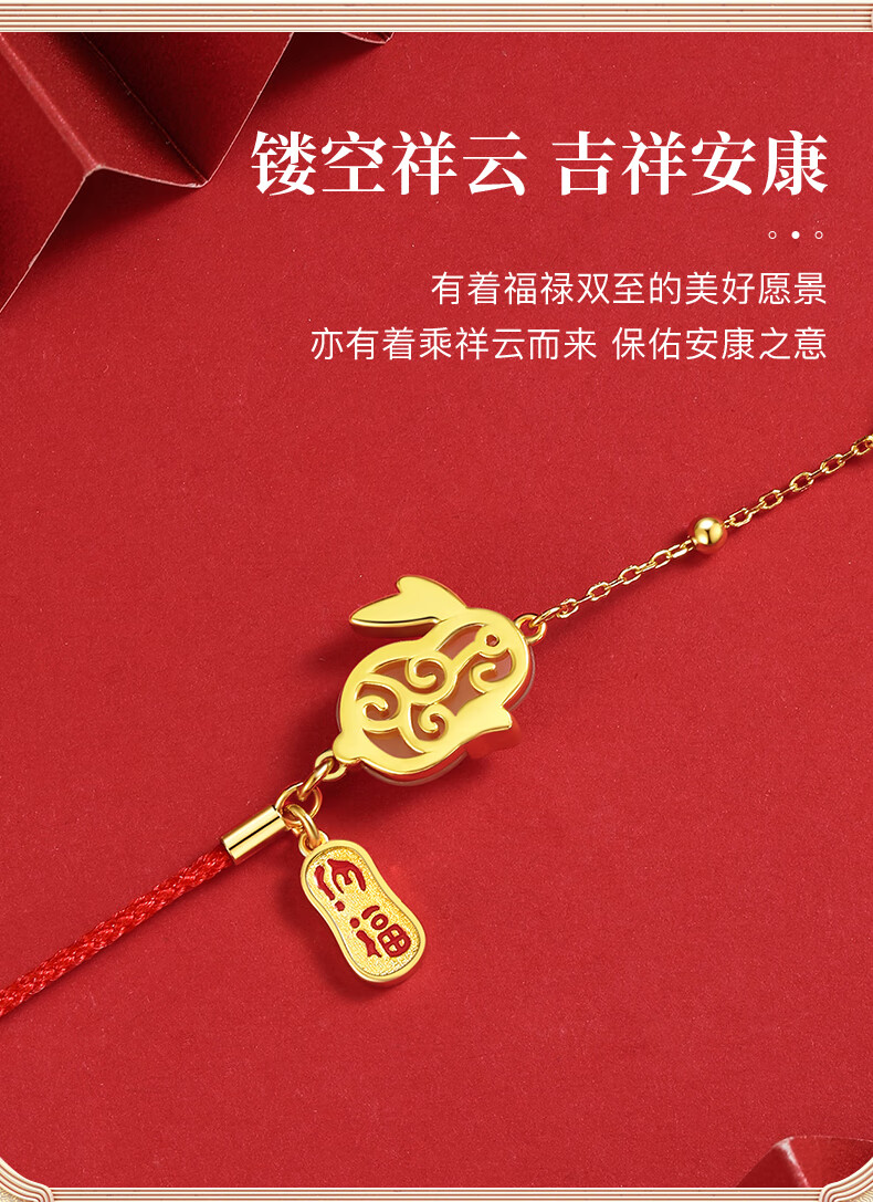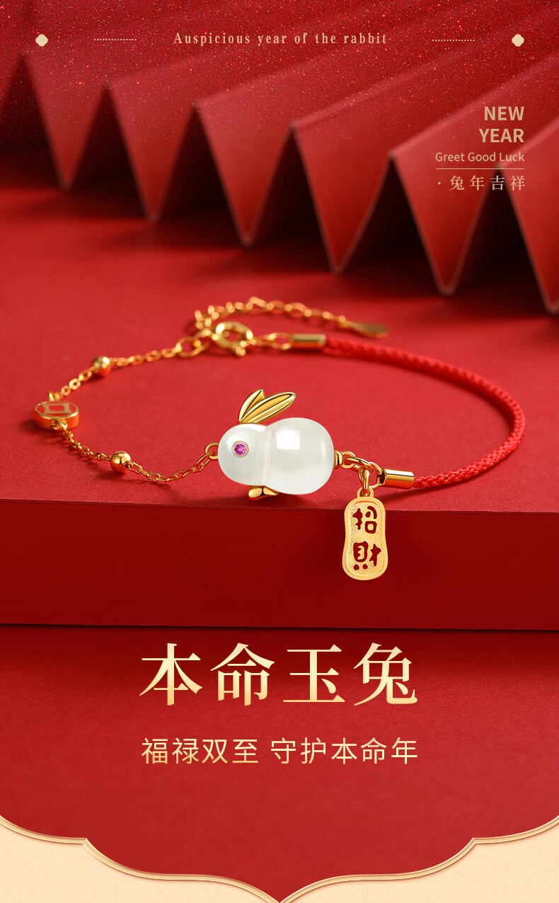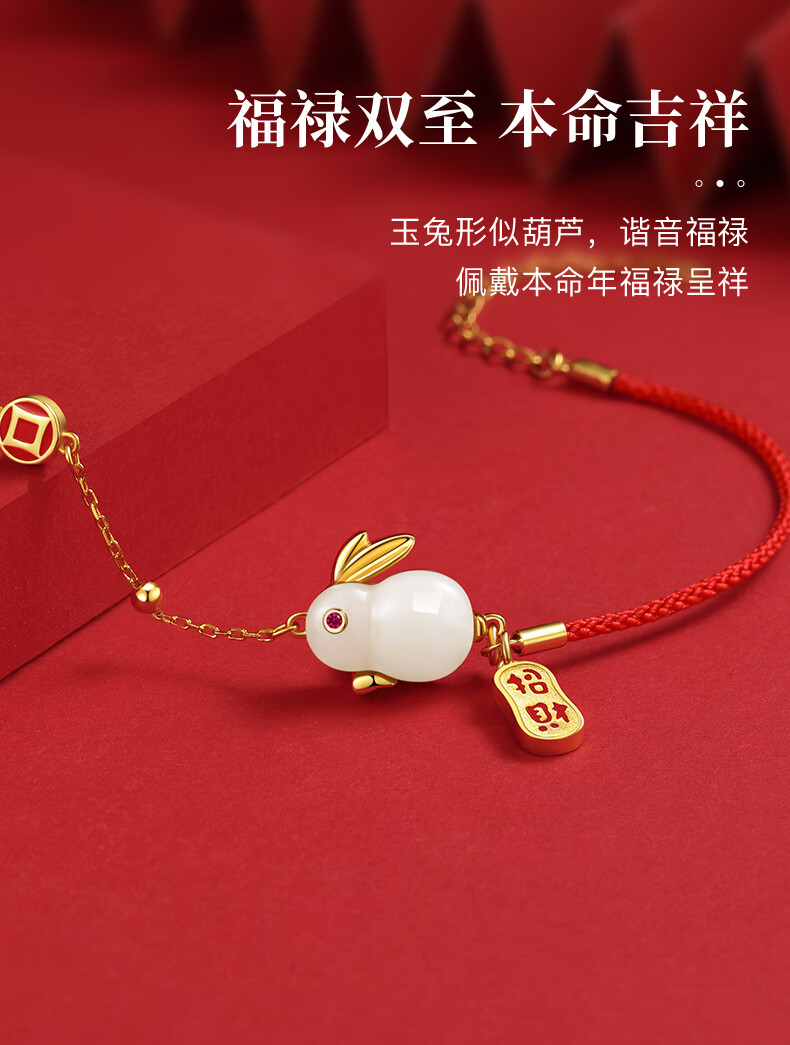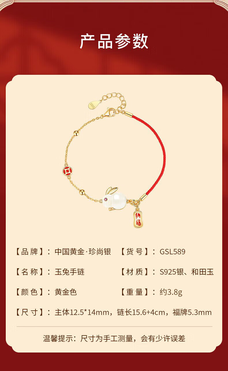 珍尚银【中国黄金】和田玉兔银手链女生日礼物纪念日送女友老婆时尚银饰